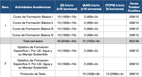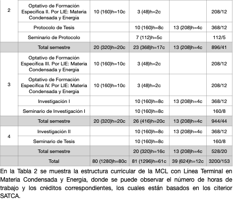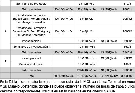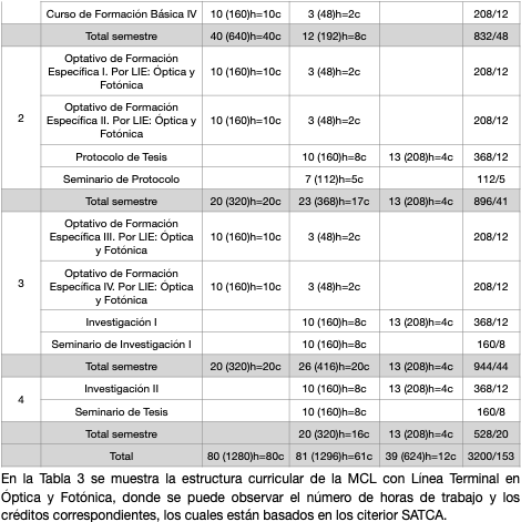En la Tabla 1, 2 y 3 se muestra la estructura curricular de la Maestría en Ciencia, donde se puede observar el número de horas de trabajo y los créditos correspondientes, los cuales están basados en los citerior SATCA.