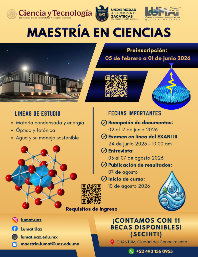 En la Universidad Autónoma de Zacatecas surge el interés por la creación de los programas de Doctorado (DCyTLM) y Maestría en Ciencia y Tecnología de la Luz y la Materia (MCyTLM) como parte de la Unidad Académica de Ciencia y Tecnología de la Luz y la Materia (LUMAT), la cual asume la responsabilidad de fomentar el desarrollo científico, tecnológico y de innovación en tres áreas fundamentales como son; a) Óptica y fotónica, b) Materia Condensada, y c) Agua y su Manejo Sostenible. Es pertinente enfatizar que uno de sus principales objetivos de los programas de Doctorado y Maestría, es contribuir a la formación de recursos humanos de alta calidad que se inserten en la vida productiva del Estado y de la Nación.